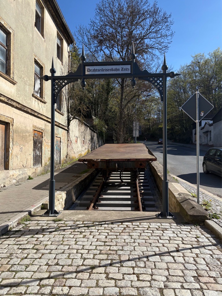 6. April 2026 - Talstation der Zeitzer Drahtseilbahn. Am 2.4.2026 wurde ein historischer Wagen durch den Verein (Historische Drahtselbahn Zeitz) dort aufgestellt. Links ein Teil des ruinösen Hotel Goldene Sonne mit angebauter Kegelbahn.